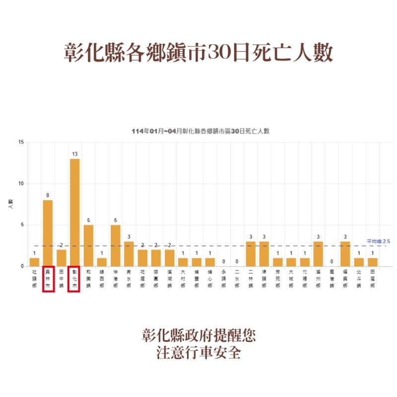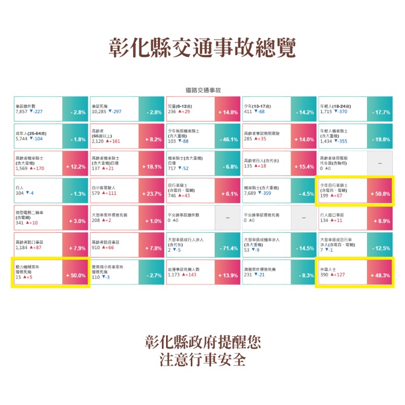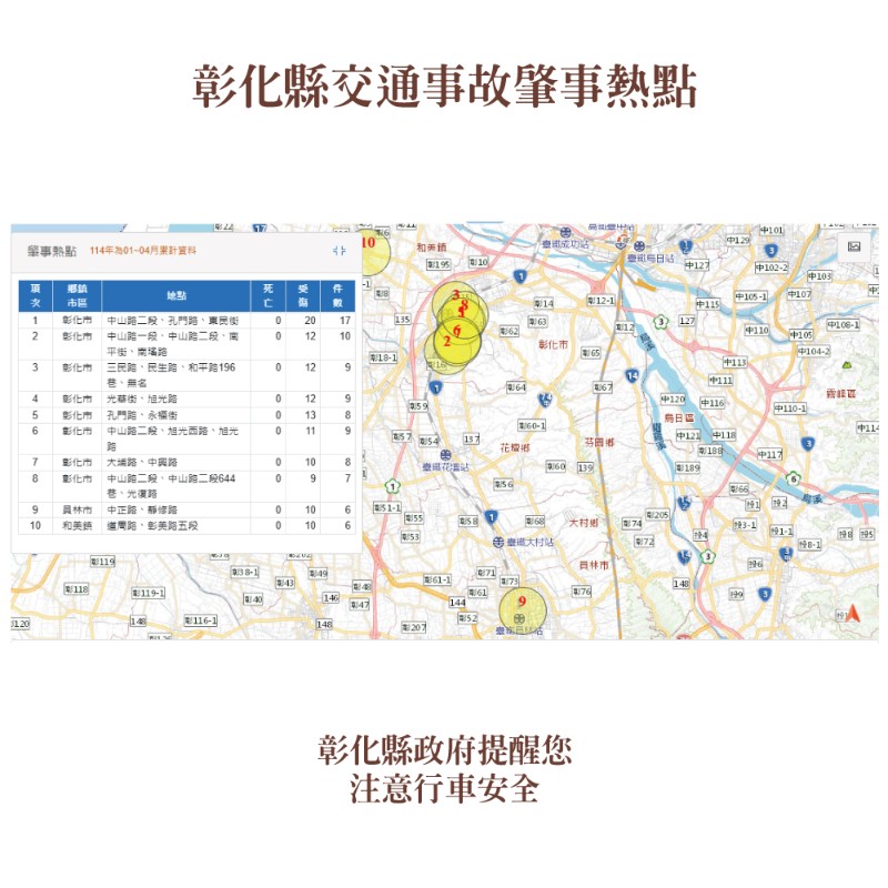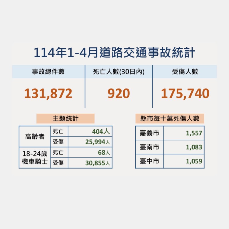 本縣114年1-4月道路交通事故死傷累計10,285人,請多加留意交通安全。
