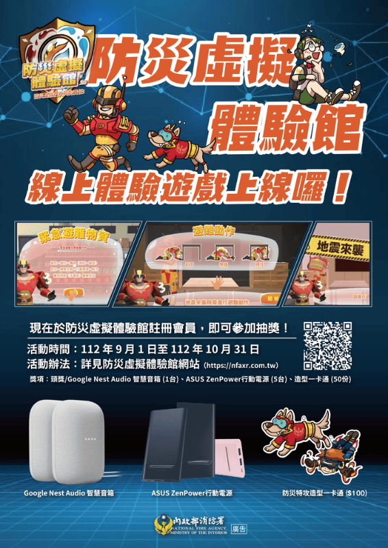 一、「防災虛擬體驗館」網站(網址:https://nfaxr.com.tw),自即日起至112年10月31日止辦理線上註冊抽獎活動,請各校於活動期間內踴躍上網參與。 二、該署訓練中心(地址:南投縣竹山鎮大公街100號)建有民眾防災體驗館,運用AR/VR等數位科技,設計沉浸式居家防災體驗遊戲,歡迎組團預約參觀(預約網址:https://reurl.cc/r6rxjZ)。
