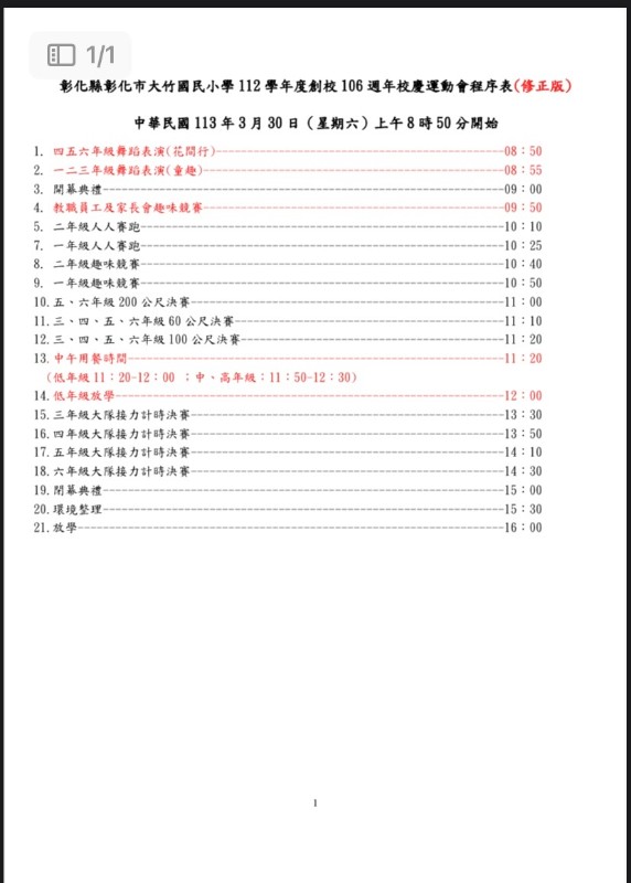 | 標題 | 彰化縣彰化市大竹國民小學112學年度創校106週年校慶運動會程序表(修正版) |