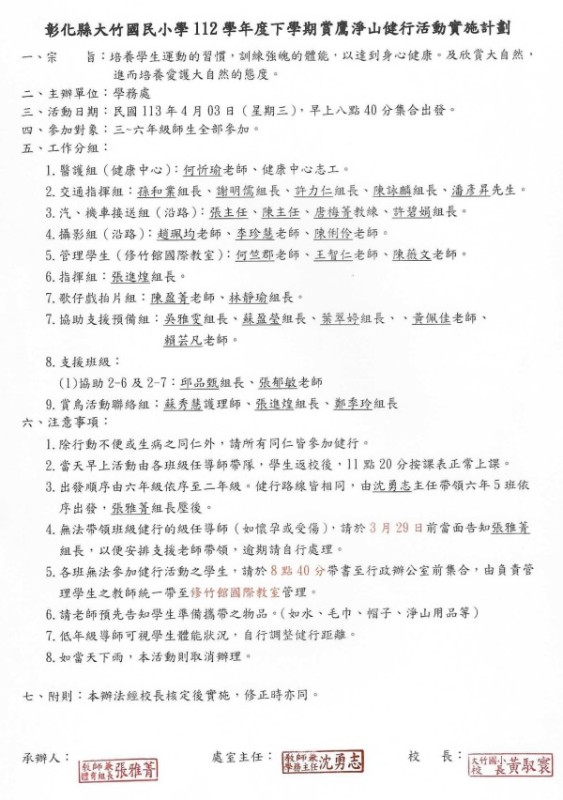 彰化縣大竹國民小學112學年度下學期賞鷹淨山健行活動 活動日期:民國113年4月03日(星期三),早上八點40分集合出發。 參加對象:三~六年級師生全部參加。 彰化縣大竹國民小學112學年度下學期賞鷹淨山健行活動實施計劃