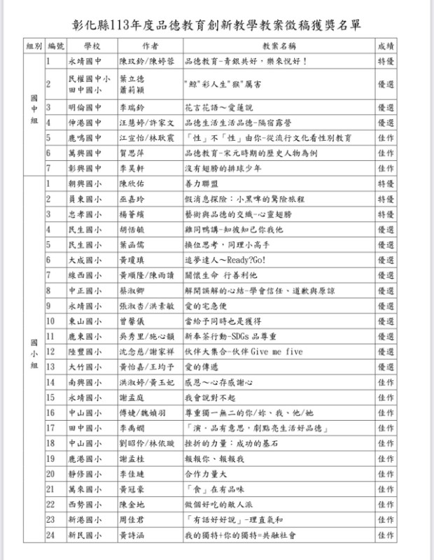 | 標題 | 恭喜黃怡嘉老師/王均予老師參加本縣113年度品德教育創新教學徵稿-國小組,榮獲「優選」 |