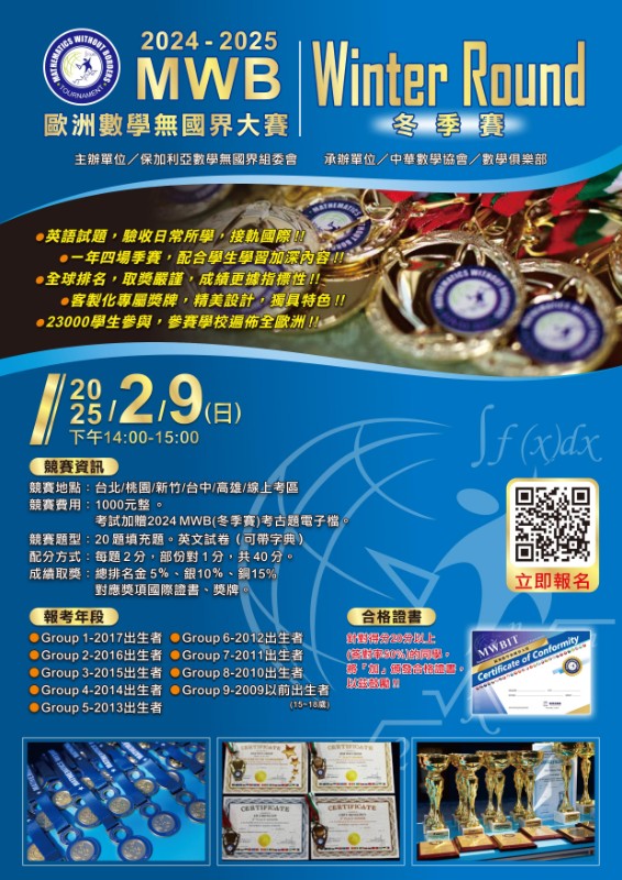 說明: 一、本競賽宗旨為:為提升國內學生數學程度,與國際數學接軌,發掘優秀人才。二、本競賽為國際競賽,試題為英文試題,可以準備紙本的英文字典或一張A4的單字表作為參考。三、其他詳細比賽資訊可參閱附件。