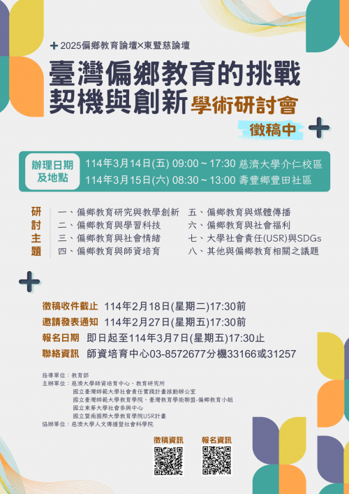 | 標題 | 轉知:慈濟學校財團法人慈濟大學訂於114年3月14-15日(星期五-六)辦理2025偏鄉教育論壇╳東暨慈論壇-「臺灣偏鄉教育的挑戰、契機與創新」學術研討會 |