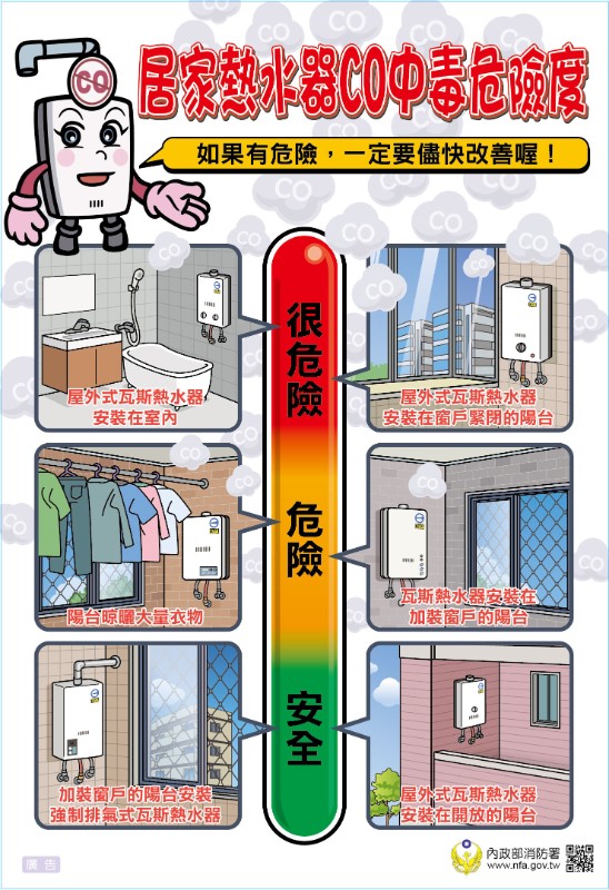 依據統計資料顯示燃氣熱水器一氧化碳中毒案件約有75.78%發生於12月、1月及2月等氣溫較低之月份。冬季氣候潮濕寒冷,民眾常因燃氣熱水器安裝不當,使用時亦未保持環境通風,而使一氧化碳中毒風險遽增。為提醒民眾注意燃氣熱水器使用安全,內政部將每年12月16日定為「一氧化碳預防日」,並將每年 12 月至翌年2月定為「一氧化碳預防季」,天氣漸寒,請依旨揭計畫協助強化學生及民眾防範一氧化碳中毒觀念,以維護人民生命財產安全。 |