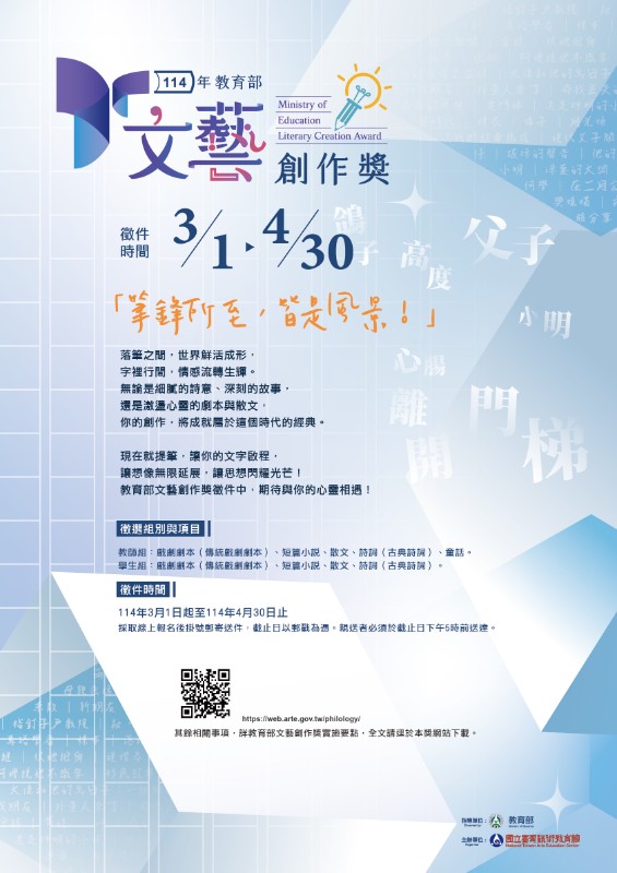 參選受理期間:自114年3月1日(星期六)起至114年4月30日(星期三)截止,採取先線上報名(網址:https://web.arte.gov.tw/philology/)後掛號郵寄送件方式辦理,截止日以郵戳為憑。親送者必須於截止日下午5時前送達。 |