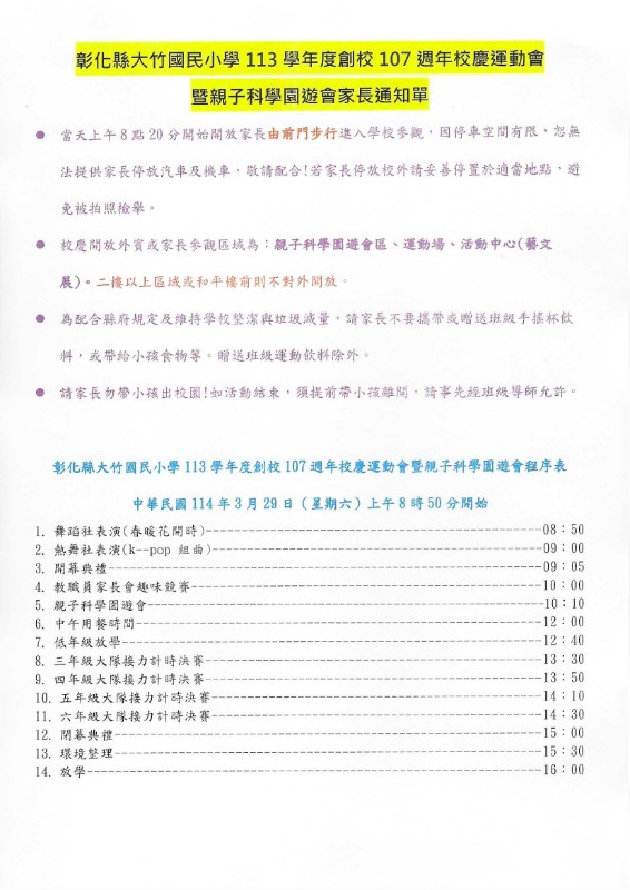 彰化縣大竹國民小學113學年度創校107週年校慶運動會暨親子科學園遊會家長通知單