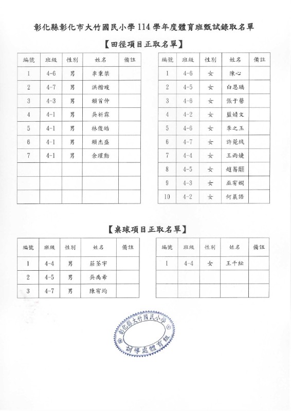 彰化縣彰化市大竹國民小學114學年度體育班甄試錄取名單 ★共錄取21位學生 男生10人(田徑7人、桌球3人) 女生11人(田徑10人、桌球1人)
