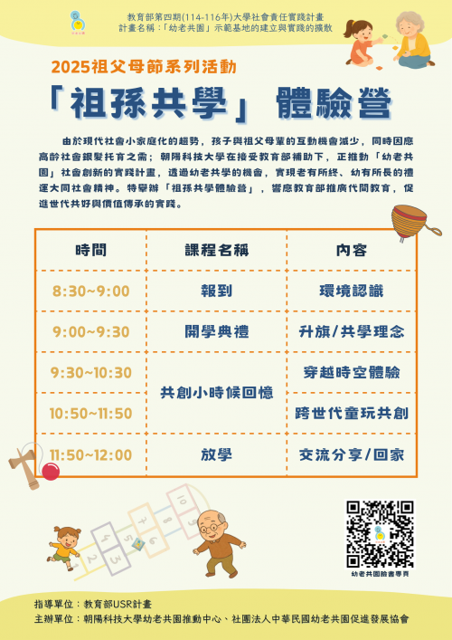 | 標題 | 轉知:朝陽科技大學執行教育部大學社會責任(USR)實踐計畫,訂於祖父母節前夕及暑假期間舉辦「祖孫共學體驗營」 |