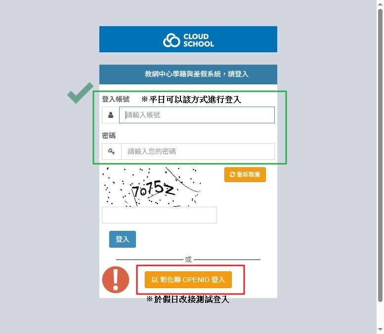※平日時段6/30(一)~7/4(五),依各系統原身分驗證機制登入,不受影響。(如圖一)教育處新雲端、(如圖二)校務系統