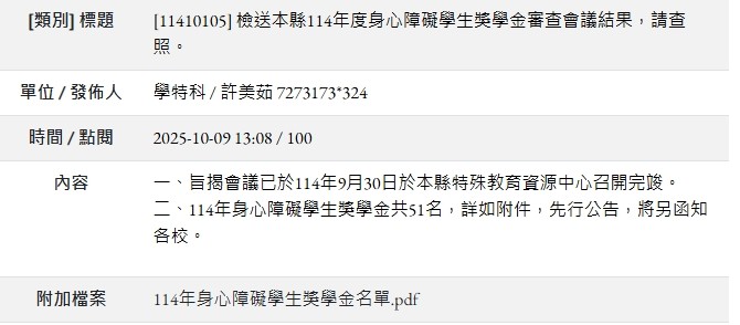 二、114年身心障礙學生獎學金共51名,詳如附件,先行公告,將另函知各校。