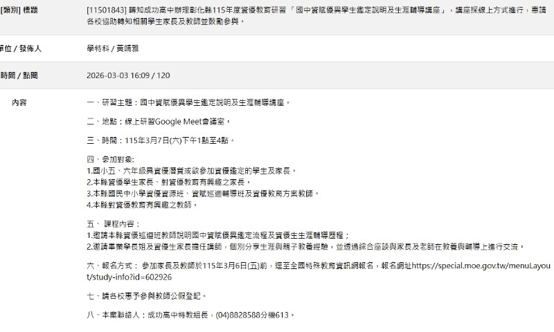 六、報名方式: 參加家長及教師於115年3月6日(五)前,逕至全國特殊教育資訊網報名,報名網址https://special.moe.gov.tw/menuLayout/study-info?id=602926