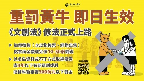 | 標題 | 轉知:文化部因應「文化創意產業發展法」第10條之1修正條文業經總統公布施行,自112年6月2日起生效,請青少年及學生不要購買黃牛票、販售票券不能加價或以不正方式(例如使用外掛程式)購買藝文表演票券,以免觸法。 |