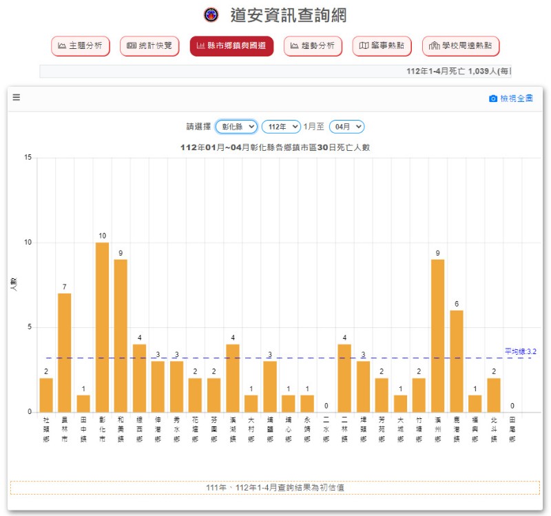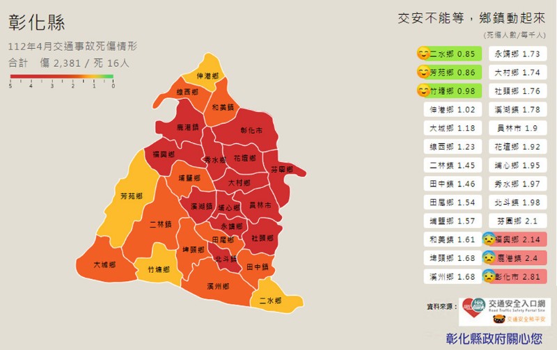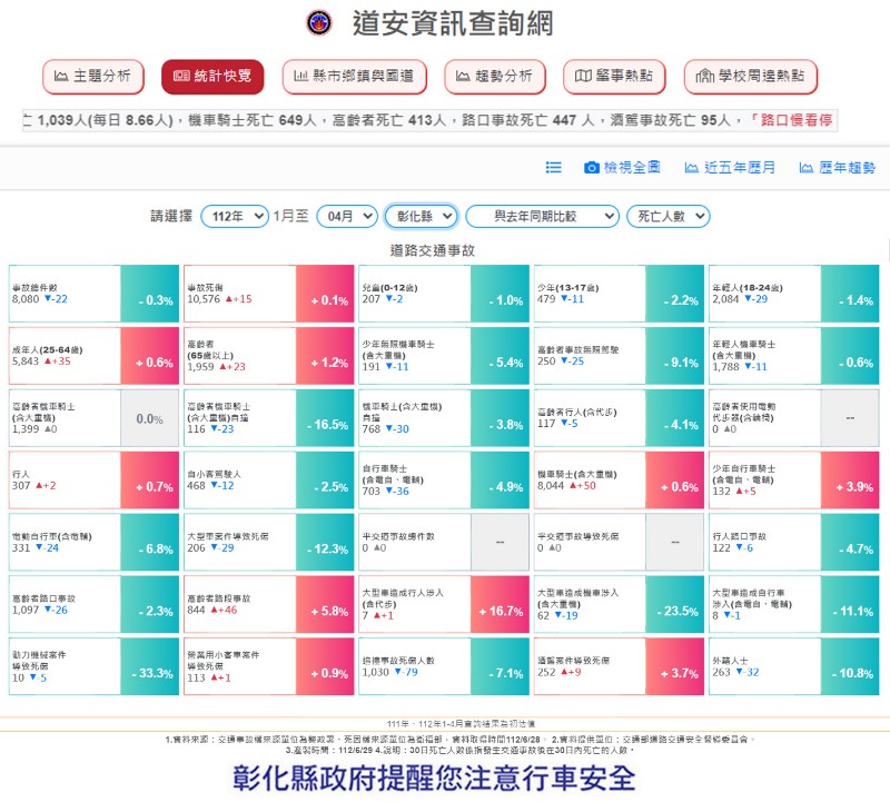 說明: (一)112年1-4月道路交通事故死傷累計10,576人,路口起步,請注意大型車視野死角及內輪差,彰化縣政府關心您。 |
