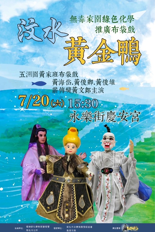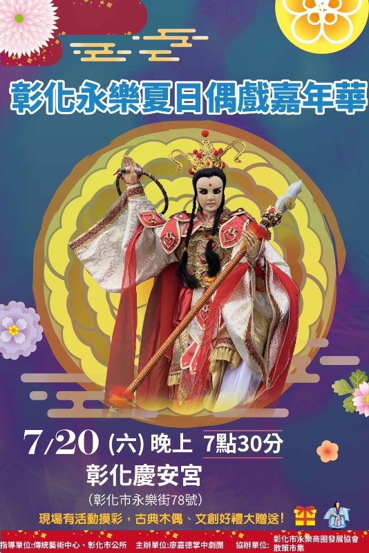 說明:一、活動內容:無毒家園綠色化學推廣布袋戲及彰化永樂夏日偶戲嘉年華二、活動時間:113年7月20日(星期六)15:10起三、活動地點:彰化慶安宮(彰化市永樂街78號)四、敬請協助轉知所屬機關同仁及學童踴躍參加。