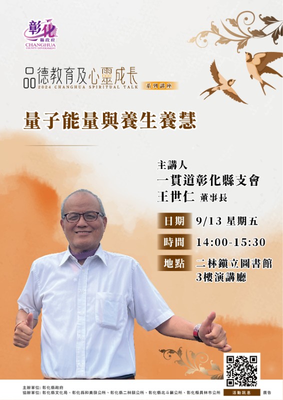 旨揭講座訂於113年9月13日(星期五)14時至15時30分於二林鎮立圖書館3樓演講廳由一貫道彰化縣支會王世仁董事長主講「量子能量與養生養慧」。 |