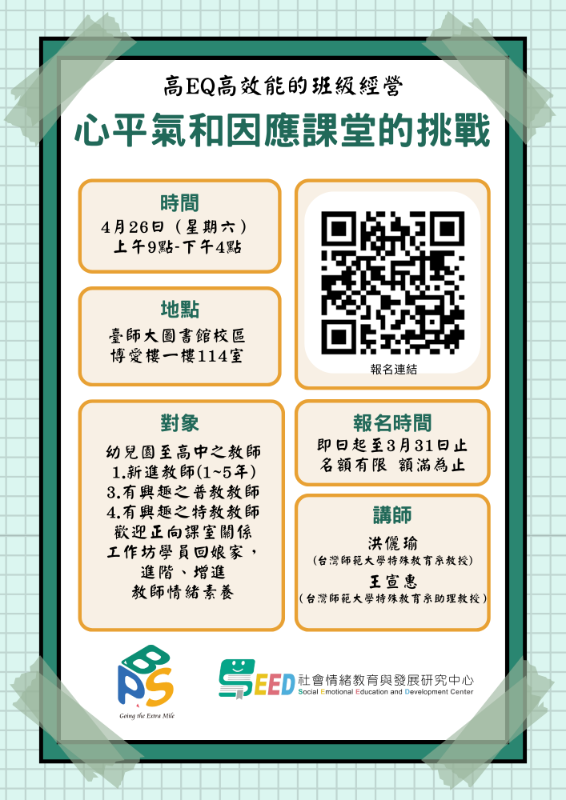 國立臺灣師範大學辦理「高EQ高效能的班級經營:心平氣和因應課堂的挑戰」工作坊 |