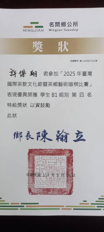 恭喜!406許傑翔參加2025年台灣國際茶飲文化節暨茶鄉藝術暗棋比賽榮獲學生B1組別第四名!