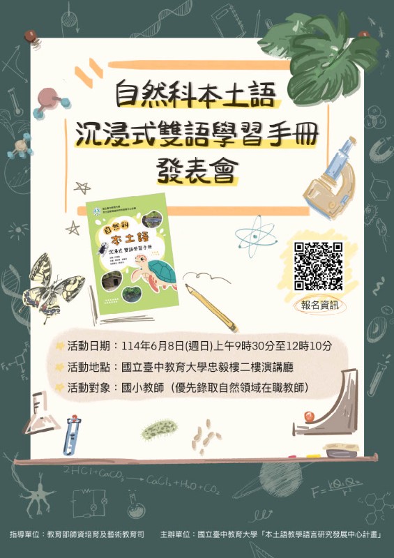 轉知:教育部師資培育及藝術教育司補助國立臺中教育大學「本土語教學語言研究發展中心計畫」辦理「自然科本土語沉浸式雙語學習手冊發表會」活動簡章