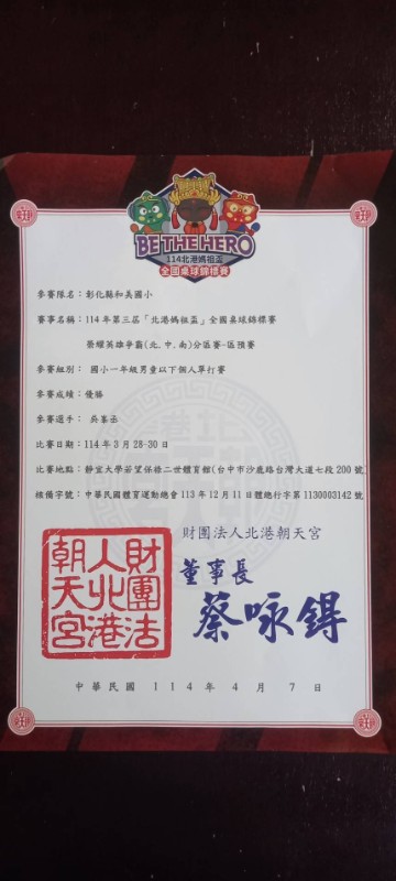 | 標題 | 恭喜! 102吳峯丞、蔡耕均參加114年第三屆北港媽祖盃全國桌球錦標賽榮耀英雄爭霸賽-區預賽,榮獲國小一年級男童以下個人單打賽優勝! | ||||||||||||