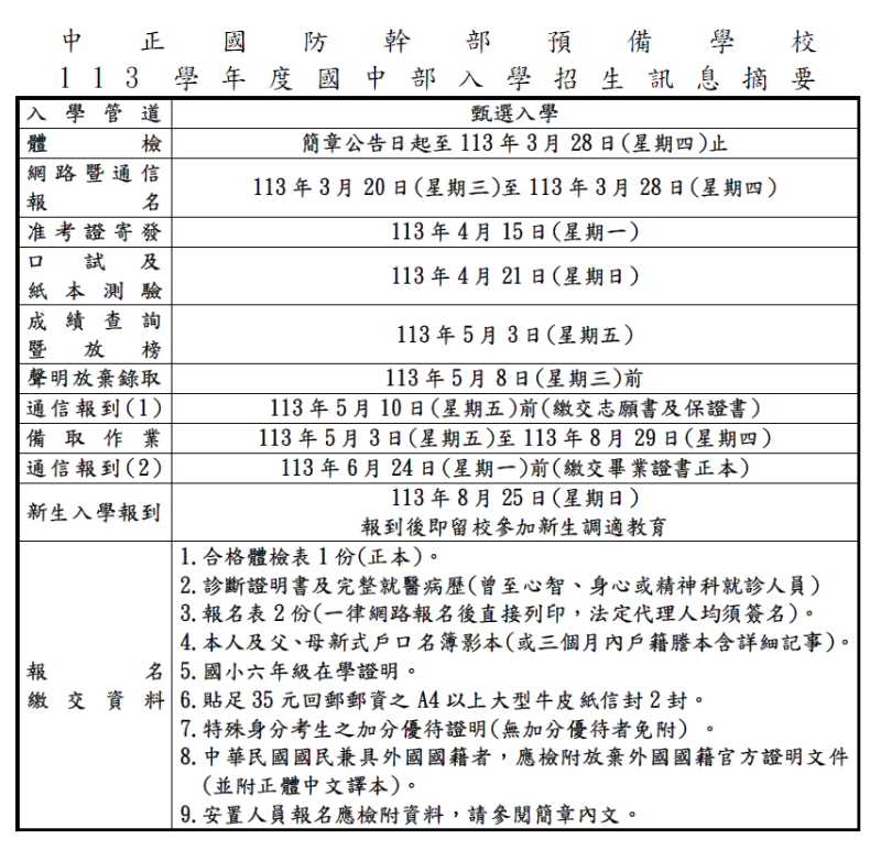 | 標題 | 轉知~中正國防幹部預備學校113學年度高(國)中部招生 |