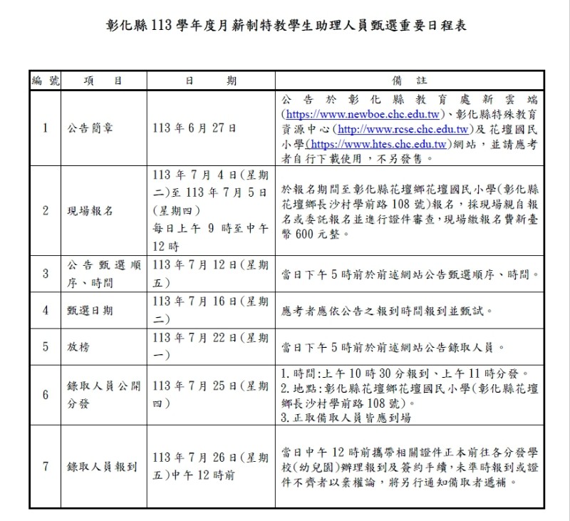 轉知~彰化縣 113 學 年 度 月薪制 特教 學生 助理 人 員甄選
