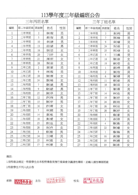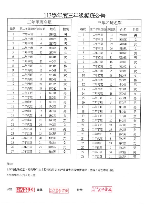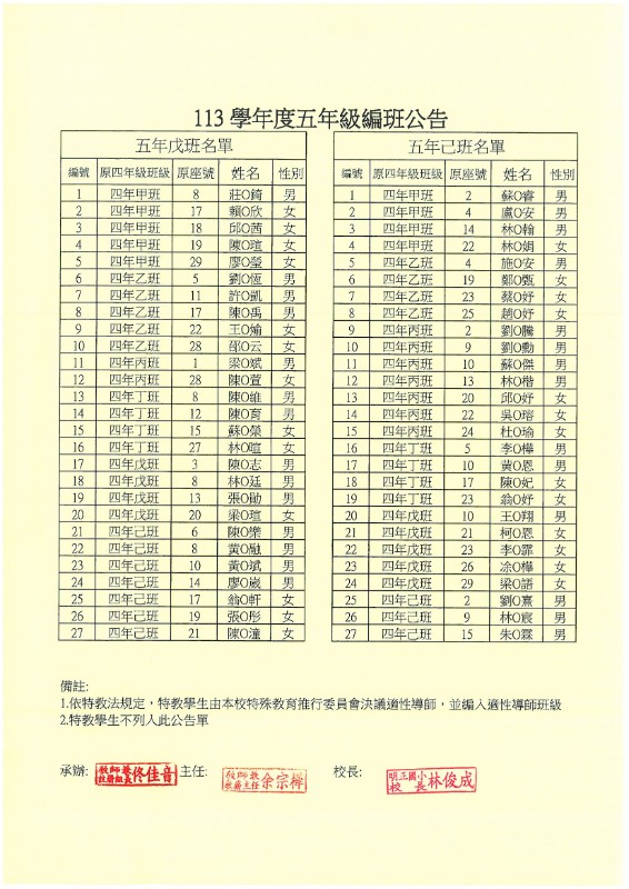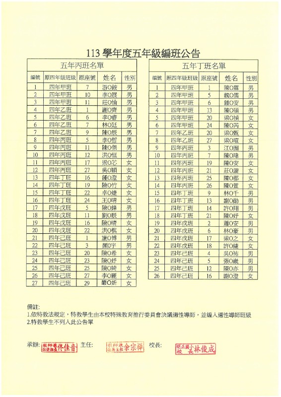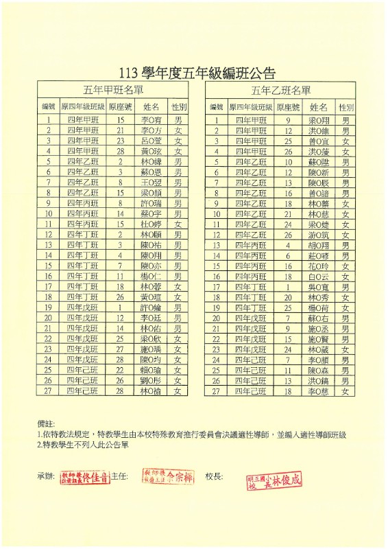 公告:明正國小113學年度三、五年級重新編班學生名單