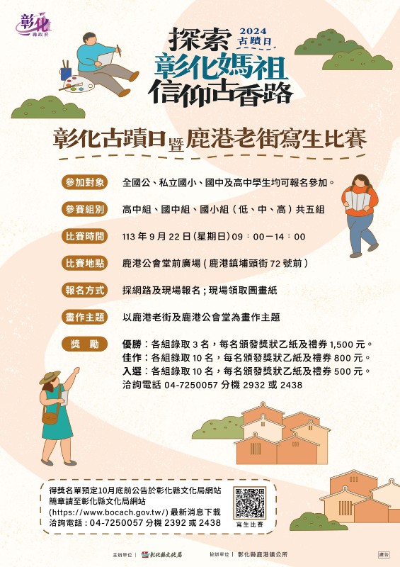 主旨:檢送本局辦理「彰化古蹟日暨鹿港老街寫生比賽」簡章及 活動宣傳EDM 各1份,請惠予協助於貴轄網站、跑馬燈及公告欄張貼宣傳,並請學校鼓勵所屬學生踴躍報名,至紉公誼。說明:一、旨揭寫生比賽日期為113年9月22日(星期日)上午9時至下 午2時,比賽地點於本縣歷史建築鹿港公會堂前廣場(鹿港鎮埔頭街72號前)。比賽組別分為高中組、國中組、國小組(低 、中、高年級)計5組,請學校鼓勵學生踴躍參加。二、有關跑馬燈文字建議為:「彰化古蹟日暨鹿港老街寫生比賽」113年9月22日(星期日)上午9時在鹿港公會堂前廣場舉行, 歡迎踴躍報名參加,詳洽彰化縣文化局網站。三、比賽簡章及報名表請至彰化縣文化局網站(https://www.boca ch.gov.tw/)查詢或下載,或洽本局文化資產科蔡先生,