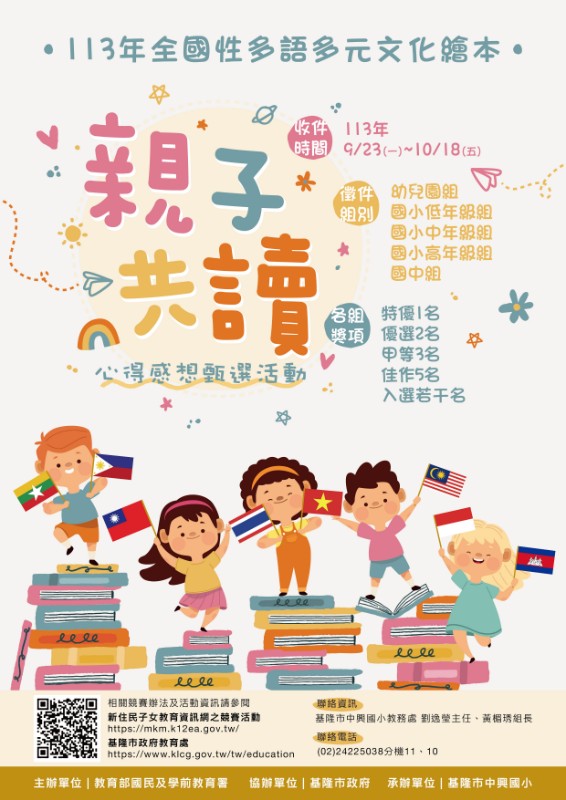 113年全國性多語多元文化繪本親子共讀心得感想甄選活動 一、參加對象:全國公私立幼兒園、國小及國中在學學生(含自學生、非營利幼兒園)。 二、收件期間:113年9月23日(星期一)至113年10月18日(星期五)止。 三、報名方式:旨揭活動採線上報名(https://mkm.k12ea.gov.tw),詳細內容請參閱活動簡章。 四、聯絡資訊:基隆市中興國小黃教學組長、教務處劉主任(02-24225038分機11、10)。 五、檢附113年度全國性多語多元文化繪本親子共讀心得感想甄選活動計畫1份。