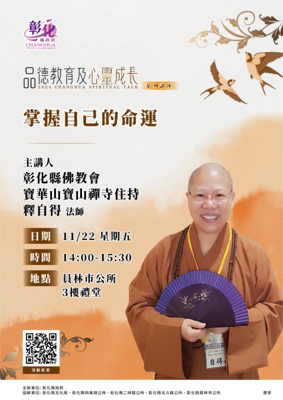 說明: 一、旨揭講座訂於113年11月22日(星期五)14時至15時30分於員林市公所3樓禮堂由彰化縣佛教會釋自得法師主講「掌握自己的命運」。 二、全程參與之公務人員及教師,核予研習時數2小時。 三、系列講座參與者,報到時領取集章卡,參加2場講座者,可獲得2張50元禮券;參加4場講座者,可獲得平底鍋1隻;參加6場完場講座者,可獲得電烤箱1台。獎品數量有限,送完即止,歡迎大家踴躍參加。 四、跑馬燈建議文字為:「彰化縣2024年品德教育及心靈成長系列講座11月22日14時,於員林市公所3樓禮堂,邀請彰化縣佛教會釋自得法師主講『掌握自己的命運』,歡迎踴躍參加。」 五、相關講座訊息可至彰化縣政府民政處網站首頁-訊息中心-活動快訊(網址: https://www.chcg.gov.tw/ch2/active.aspx?bull_id=400050&utm_source=shorturl&utm_medium=line&utm_campaign=active)查詢。