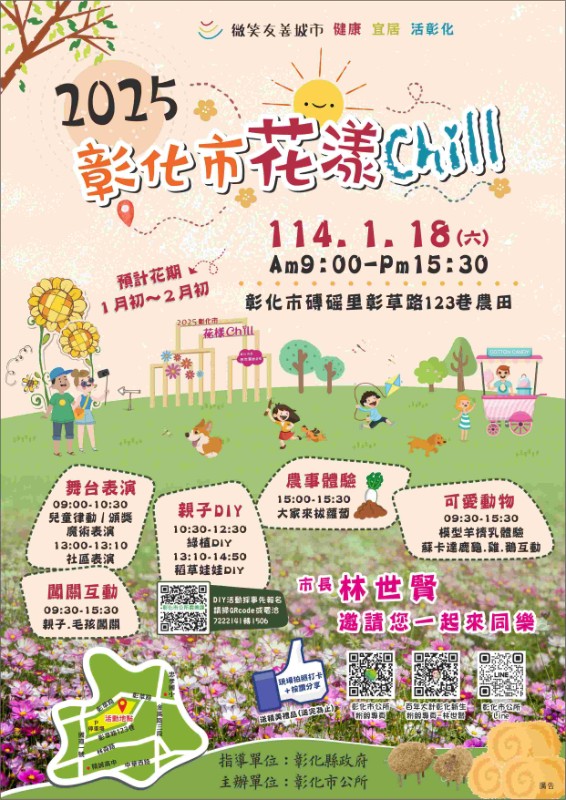 說明: 一、旨揭活動內容有活力舞台魔術秀表演、綠植、稻草娃娃DIY、萌寵互動、拔菜頭農事體驗及親子闖關遊樂體驗,還有花田市集、在地農特產品展售等,詳如DM。 二、活動時間:114年1月18日上午9時至下午3:30時,活動地點:彰化市彰草路123巷入口旁農地(近金馬路3段)。