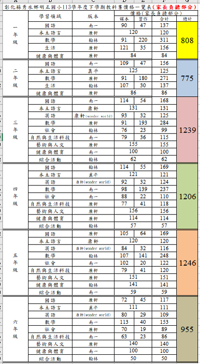 科書價格一覽表(家長負擔部分)