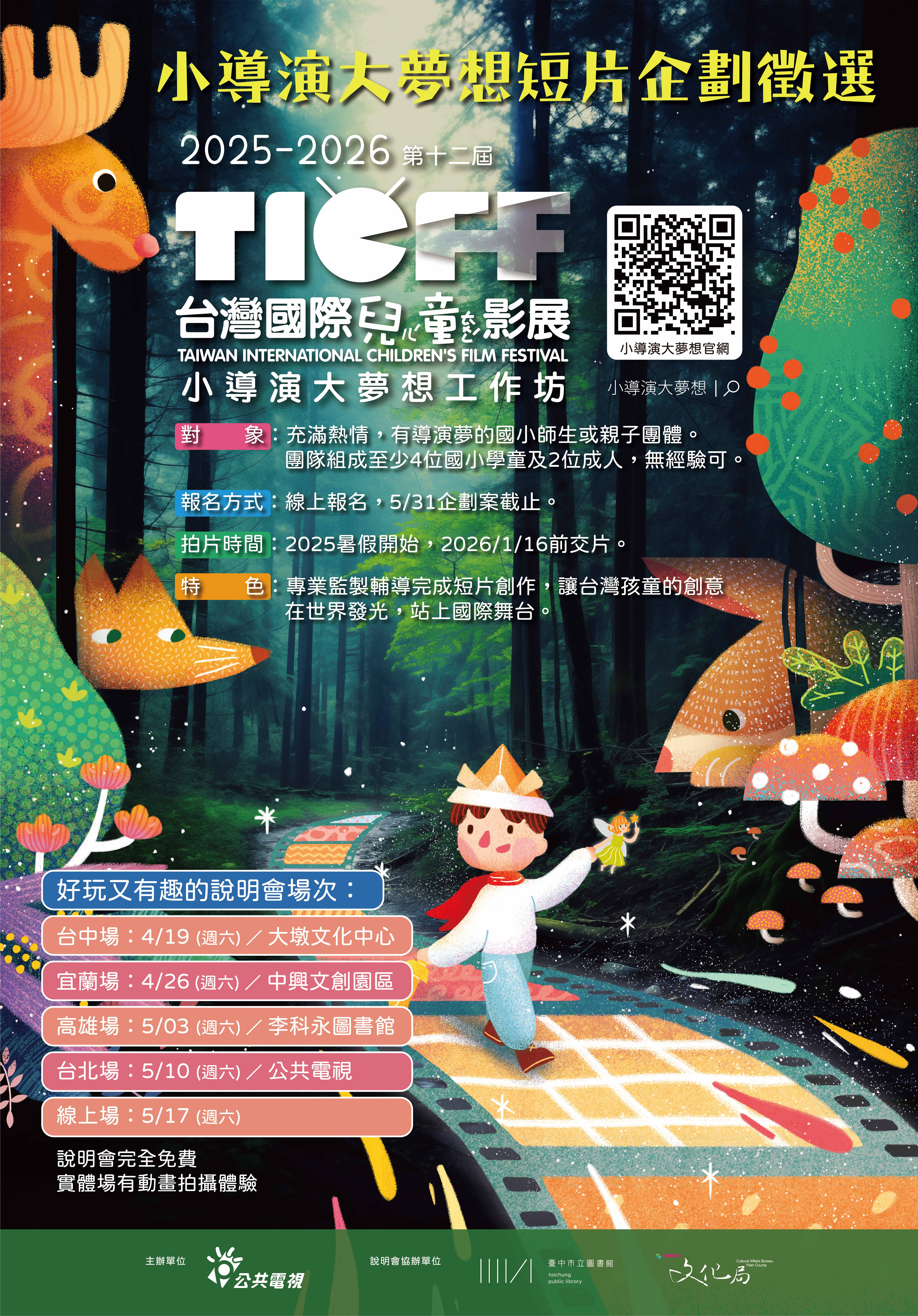 說明: 一、公視為推廣兒少影像教育,透過「小導演大夢想工作坊」兒童影像教育計畫,號召對影像創作感興趣的國小師生、親子團隊,先徵件再提供培訓輔導的方式,鼓勵組隊參與短片創作。歷屆經工作坊輔導所完成優質作品在國內外各大兒童影展屢獲獎勵肯定,讓台灣兒童創意在國際上綻放光芒。 二、公視2025「小導演大夢想工作坊」即將開跑,本會將舉辦「短片創作說明會」說明參加辦法及相關活動內容。說明會場次為2025/4/19台中大墩文化中心、4/26宜蘭中興文創園區、5/3高雄李科永圖書館、5/10台北公共電視、5/17線上場。邀請專業影像工作者教授拍片企劃案撰寫、及小導演團隊分享拍片趣事,歡迎踴躍參加。說明會活動全程免費,請於活動官網線上報名。 三、「兒童短片企劃案徵選」於2025/5/31截止收件,歡迎國小師生、親子團隊組隊上網報名。提出拍片企劃參加徵選,入選團隊可享整套拍片輔導資源,完成短片擇優送國際參展。相關活動細節請上活動官網 https://www.pts.org.tw/dreamer12/