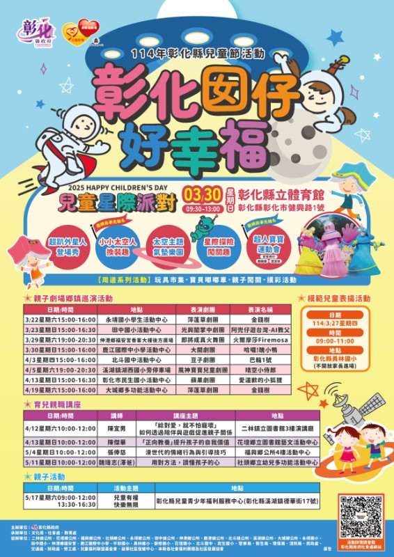 說明: 一、旨揭活動以「兒童權利公約」及「兒少安全」為主軸,邀請縣內家庭齊聚參與,鼓勵家長帶領兒童積極參與各項休閒育樂活動,並增進親子互動情感,透過本活動各項業務宣導,提升參與者對兒童權利公約及縣政福利資源之認識。 二、活動時間及地點如下: (一) 日期:114年3月30日(星期日)上午9時30分至下午1時。 (二) 地點:彰化縣立體育館(彰化縣彰化市健興路1號) 三、活動內容:「超趴外星人」登場秀、超人寶寶運動會(寶寶爬行、搬搬樂、滾滾球)、太空主題玩樂氣墊、親子手作小小太空人裝、氣球魔術秀、玩具市集、寶貝嘟嘟車、星際探險闖關趣、兒少團體表演等精彩活動及摸彩抽大獎,敬邀民眾同樂。 四、活動訊息請至本府社會處網站/活動訊息專區/114年彰化縣政府「彰化囡仔好幸福」慶祝兒童節系列活動(https://reurl.cc/ZZRY8a)參閱。 五、請貴單位協助透過跑馬燈、電視牆 、社群網站等多元方式宣導,以增加活動曝光度。 六、檢附活動海報EDM1份