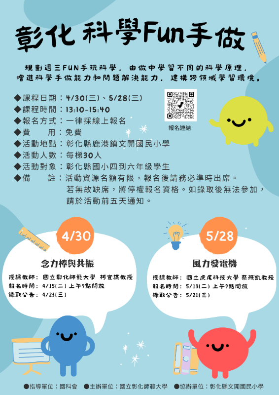 說明:一、活動說明:引導學生由做中學習不同的科學原理,增進科學手做能力和問題解決能力,建構跨領域學習環境。二、活動日期:4/30(三)、5/28(三)三、活動時間:下午1:10-3:40四、活動費用:免費五、活動地點:彰化縣鹿港鎮文開國民小學六、活動對象:彰化縣國小四到六年級學生七、報名方式:一律採線上報名八、報名網址:https://forms.gle/qHnSqR9Tmxd1HFsy9九、其餘活動詳情請參閱附件。