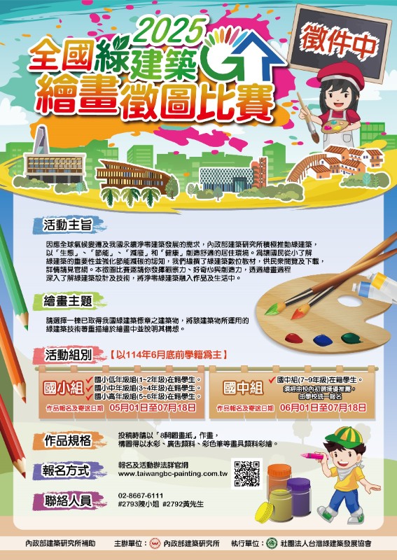 說明: 一、為加強綠建築扎根教育成效,本所自105年起補助社團法人台灣綠建築發展協會辦理「全國綠建築繪畫徵圖比賽」,引導學生、教師及家長至綠建築現地觀摩,使學生在繪畫比賽創作過程中,深入了解綠建築意義,加強學習成效。 二、本(114)年度「2025全國綠建築繪畫徵圖比賽」活動說明如下: (一) 國民小學組參賽資格: 1、低年級組1~2年級在籍學生。 2、中年級組3~4年級在籍學生。 3、高年級組5~6年級在籍學生。 (二) 繪畫主題:以取得綠建築標章建築物或優良綠建築為主,用創意巧思將綠建築基本概念呈現於繪畫中,俾以展現臺灣綠建築之美。 (三) 參賽作品報名及送件時間: 1、參賽作品網路報名:114年5月1日至7月18日。 2、參賽作品寄送截止:114年7月18日下午5時前。 (四) 活動詳情與報名資訊,請至本所補助單位社團法人台灣綠建築發展協會比賽官網(www.taiwangbc-painting.com.tw)查詢,或撥打聯絡電話(02)8667-6111分機2793、2792洽詢。 三、隨文檢送活動海報1份,敬請踴躍報名參加。