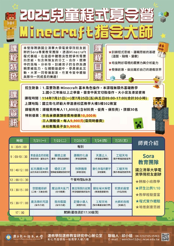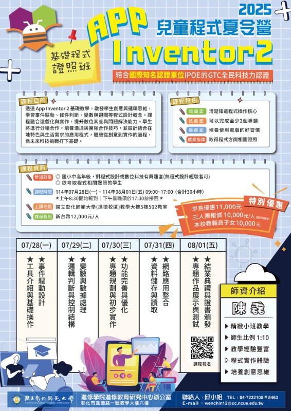 說明: 一、「【2025兒童程式夏令營】Minecraft 指令大師」 (一) 課程特色:本營隊聘請國立清華大學電資學院校友創辦的Sora專業教育團隊,透過Minecraft程式模組,在遊戲中體驗良性競爭所需要的思維,包含與隊友的分工、合作,競賽中的策略、分析等,訓練孩子的合作與邏輯思維能力。 (二) 課程時間::114年07月21日(一) ~ 114年07月25日(五) 09:00~17:00,合計30小時。 (三) 上課地點:國立彰化師範大學進德校區教學大樓5樓502教室。 (四) 課程費用:11,800元/人。早鳥享優惠課程費用優惠10,500元;三人團報價,每人9,900元(需同時缴費)。 二、「【2025兒童程式夏令營】App Inventor 2 基礎程式證照班」 (一) 課程特色:透過學習 App Inventor 2 的基礎程式設計概念,引導學生設計自己的創意應用程式並結合國際知名認證單位IPOE的GTC全民科技力認證,啟發學生的創意與邏輯思維。 (二) 課程時間::114年07月28日(一) ~ 114年08月01日(五) 09:00~17:00,合計30小時。 (三) 上課地點:國立彰化師範大學進德校區教學大樓5樓502教室。 (四) 課程費用:12,000元/人。早鳥享優惠課程費用優惠11,000元;三人團報價,每人10,000元(需同時缴費) 。 三、報名步驟:線上報名,請至本校進修學院報名管理系統報 名 。如第一次報名,請先申請帳號。(https://aps.ncue.edu.tw/cee/index.php) 四、如有相關問題,請向本校進修學院進修教育研究中心洽詢 : 04-7232105 分 機 5463 邱 小 姐 , E-mail :wenchin12@cc.ncue.edu.tw。