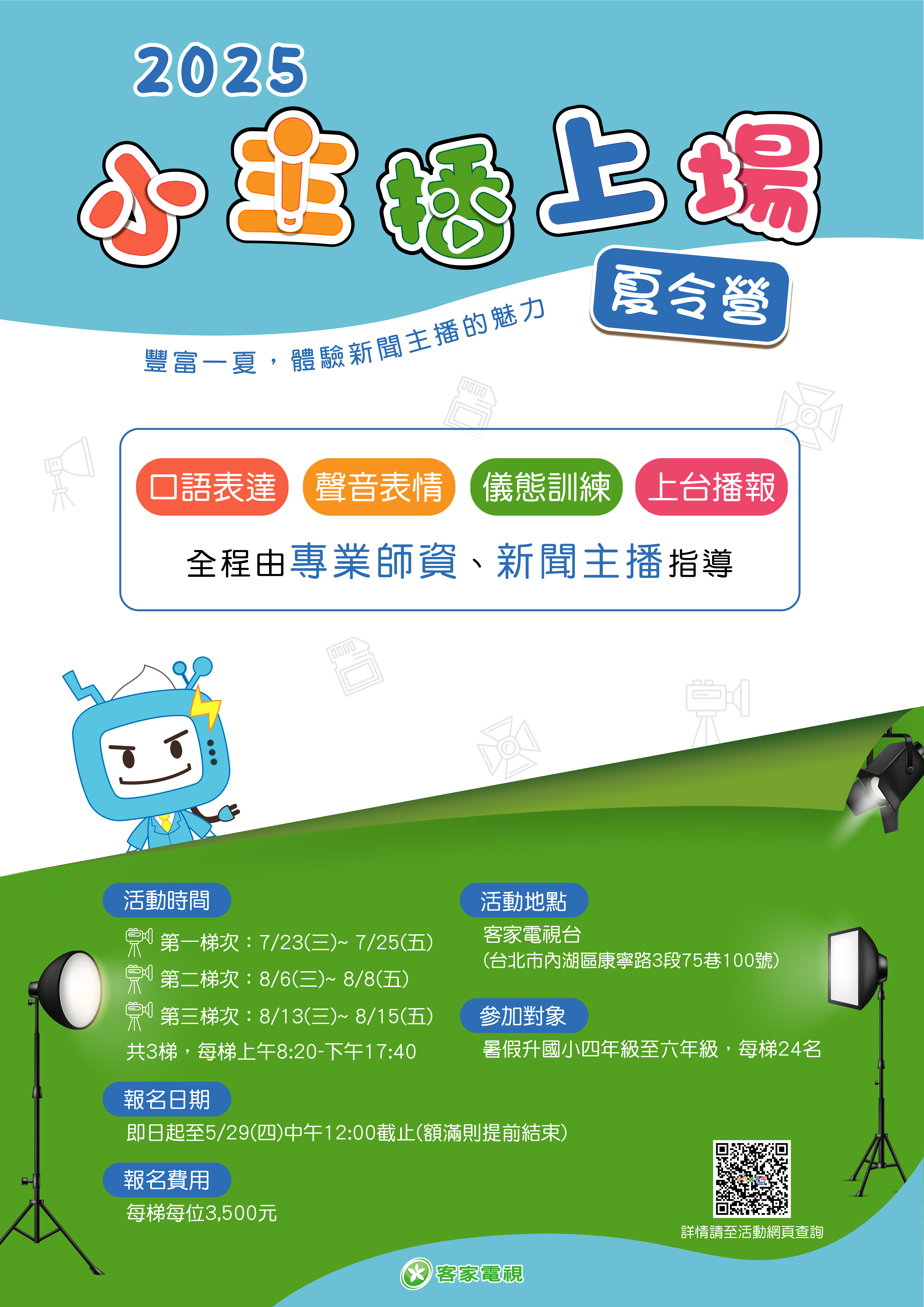 說明: 一、為增進學童媒體素養、語言表達能力及團隊合作精神,並透過分組學習與實際演練,體驗新聞製作及主播播報技巧,本會客家電視特於暑期舉辦「2025客家電視小主播上場夏令營」,針對暑期後國小四到六年級學生設計內容,並邀請專業講師及新聞主播進行授課。 二、本次營隊費用為新臺幣3,500元,每梯次僅招收24位學生。 (一) 第一梯次:2025年7月23日至7月25日 (二) 第二梯次:2025年8月6日至8月8日 (三) 第三梯次:2025年8月13日至8月15日 三、本次營隊採網路報名,報名期間為即日起至5月29日中午12:00止,額滿將提前截止報名。 四、詳情請參見附件辦法,或至活動網頁 https://www.hakkatv.org.tw/post/1745559096834981 ,如有任何疑問,歡迎聯繫行銷活動組李小姐,(02)2630-2081,event@hakkatv.org.tw。