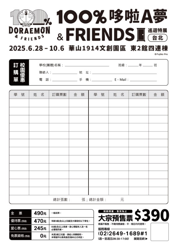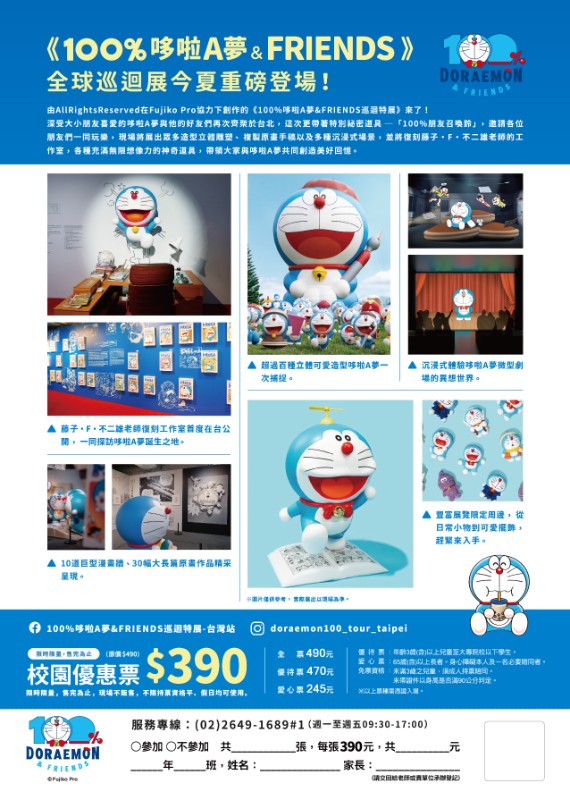說明: 一、《100%哆啦A夢&FRIENDS》全球巡迴展今夏登台!深受大小朋友喜愛的哆啦A夢與他的好友們再次齊聚於台北,這次更帶著特別祕密道具─「100%朋友召喚鈴」,邀請各位朋友們一同玩樂,現場將展出眾多造型立體雕塑、複製原畫手稿以及多種沉浸式場景,還將重現藤子・F・不二雄老師的工作室,以及各種充滿無限想像力的神奇道具,帶領大家與哆啦A夢共同來創造許多美好回憶。 (一) 100%升級!超過100多個立體造型哆啦A夢重磅登台! (二) 結合微型劇場與光影特效的沉浸式體驗,帶來全新的驚喜與感動! (三) 經典場景重現,召喚好友們與哆啦A夢來張夢幻合影! (四) 展覽獨家限定週邊商品,可愛魅力必收藏! 二、展區亮點 (一) 一探哆啦A夢誕生之地,藤子・F・不二雄老師復刻工作室首度在台公開。現場復刻哆啦A夢漫畫作者藤子・F・不二雄創作時的工作桌,並忠實還原其作畫環境,帶領觀眾從老師視角出發,探索簡單流暢的描繪線稿是如何勾勒出活靈活現的經典角色,近距離感受哆啦A夢靈感誕生的瞬間與創作過程。 (二) 驚喜不間斷!超過百種立體造型哆啦A夢一次捕捉。大口吃銅鑼燒、口袋變出任意門、戴上竹蜻蜓飛上天等經典造型的哆啦A夢?!紫色蕃薯、狸貓、野狼、雪人、吸血鬼及多種混合體等奇妙變身裝扮的哆啦A夢?!繽紛多彩的立體雕塑穿梭於展場之間,顛覆你的想像。 (三) 多重體驗,再次進入哆啦A夢天馬行空異想世界。100%微型劇院,獨家放映由日本團隊專為台灣展覽製作的原創短篇動畫;透過鏡面打造空間延伸感的「無限哆啦A夢世界」,及結合3D光雕投影漫畫單行本的「大雄的互動漫畫閱讀房間」,各式各樣的視覺享受與沉浸式空間,彷彿置身於充滿奇幻與樂趣的哆啦A夢冒險故事中。欣賞多幅彩色原畫復刻作品之餘,更有各種哆啦A夢從兩旁的牆壁中躍然而出,與觀眾相遇。彷彿進入百寶袋,從時光布到更衣照相機,再從空氣槍到馬竹,一覽哆啦A夢各種有趣的特別小道具。10道巨型漫畫牆、30幅大長篇原畫復刻作品及7個立體雕塑,精彩呈現10部哆啦A夢大長篇的電影世界。共同回味經典,與哆啦A夢一起前往各種奇幻世界展開冒險。 三、「100%哆啦A夢&FRIENDS巡迴特展 台北站」基本資訊: (一) 展覽時間:114年6月28日~114年10月6日。 (二) 營業時間:每日10:00-18:00 (17:30停止售票入場)。 (三) 展覽地點:臺北市華山1914文化創意產業園區 東2館四連棟。 四、票價: (一) 學校優惠票,不分大人、小孩皆為390元,平日、假日均可使用。 (二) 現場票價: 1、全票$490:一般身分者適用。 2、優待票$470: (1) 持大專院校(含)以下有效學生證件,以當學期註冊章為憑,入場須驗證,每證限購一張,碩博士生、社區大學、空中大學及在職進修等不適用。 (2) 年滿3歲(含)以上之兒童(未滿12歲兒童不可獨自入場,需成人持票陪同入場) 。 五、敬請惠予公告本展覽相關訊息於貴單位。 六、檢送本活動海報、電子文宣正、反面、訂購單,呈請 貴校員工、師生及家長踴躍參加。 七、本案聯絡人:活動推廣部校園優惠票服務專線:(02)2649-1689#1(代表號)服務時間:周一至周五09:30-17:00