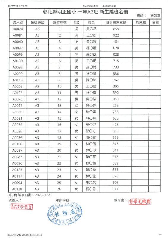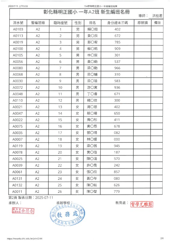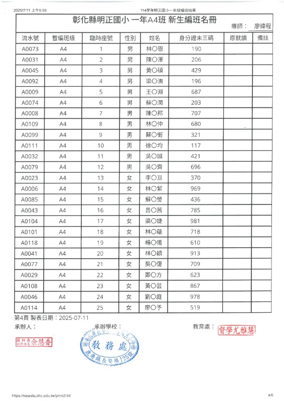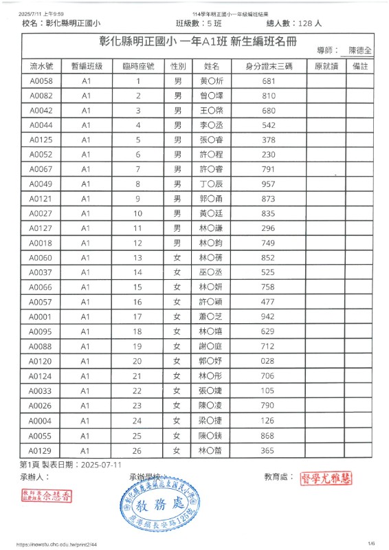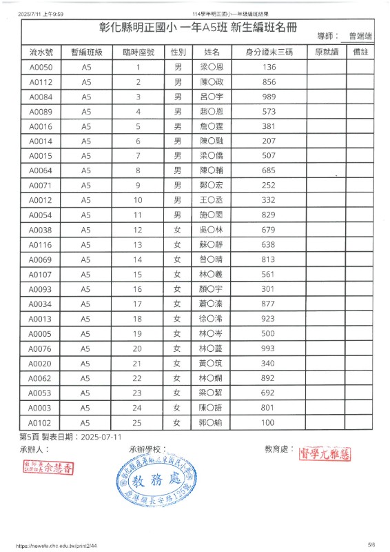 公告: 明正國小114學年度新生入學電腦亂數編班結果