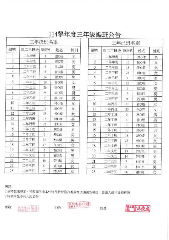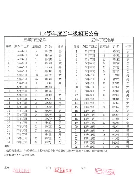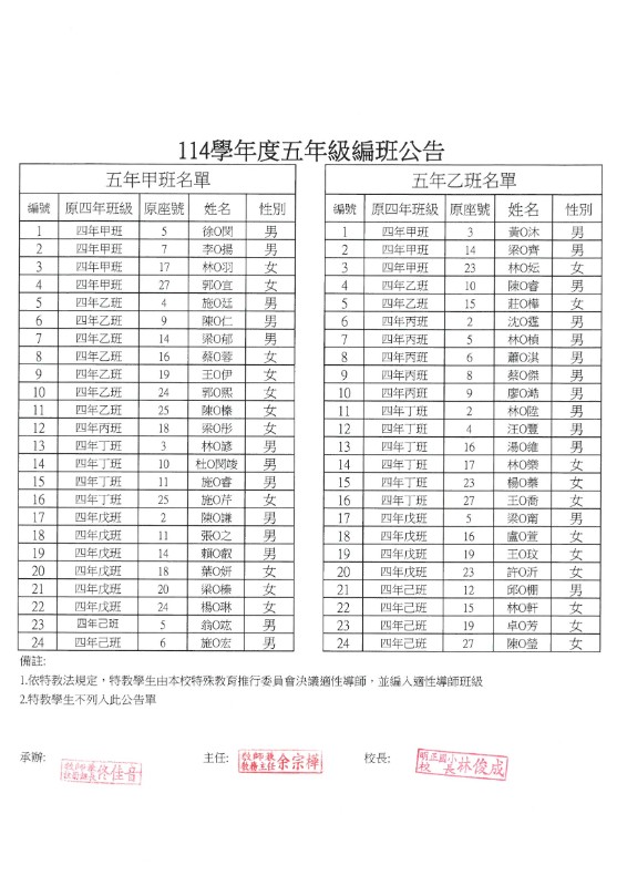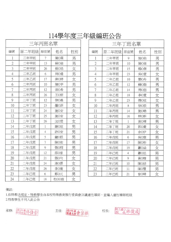 公告:明正國小114學年度三、五年級重新編班學生名單