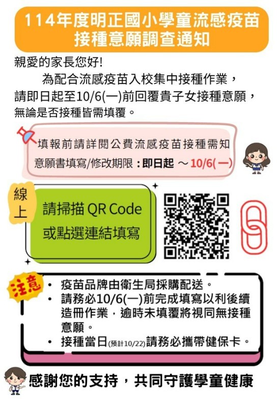 | 標題 | ★114年度明正國小學童流感疫苗校園接種意願填寫調查(即日起,至114年10月6日)★ |