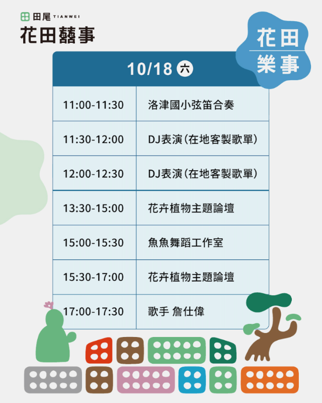 說明: 一、2025台灣設計展於114年10月10日至10月26日在彰化盛大登場,有關「花田衣秀」活動資訊如下: (一) 田尾時裝秀:114年10月24日(星期五)下午1時30分至3時30分,於隆盛樹化玉博物館舉行。 (二) 花漾行:114年10月25日(星期六)下午1時30分至3時,於怡心園廣場與親子公園舉行。 二、活動相關資訊及報名可進入本局官方網站/訊息專區/活動訊息或至本局Facebook粉絲團查詢,亦可撥打0800-476969專線洽詢。