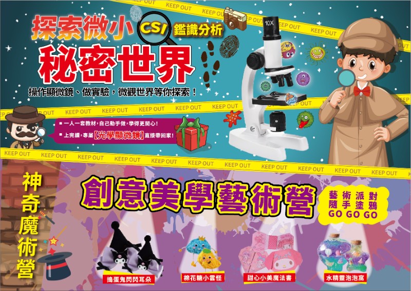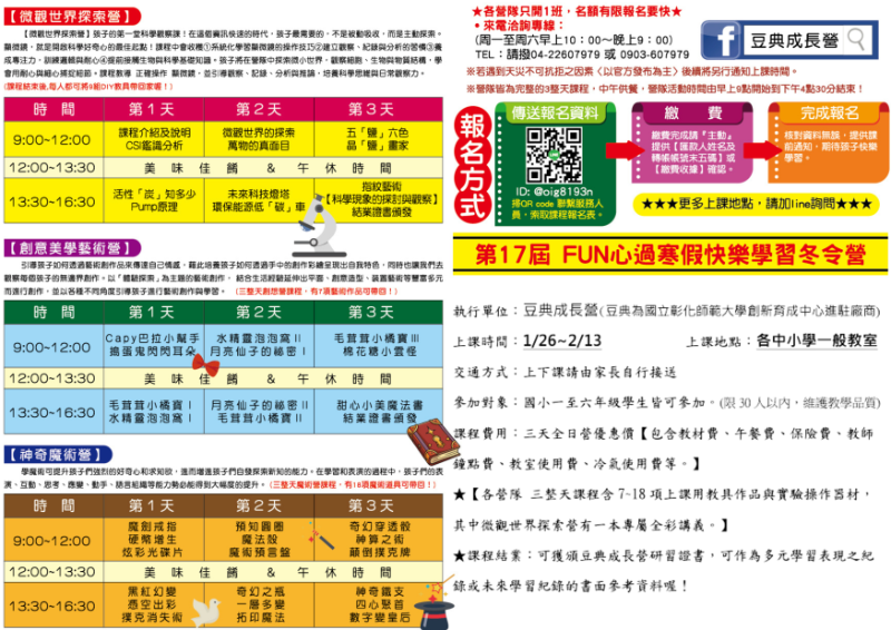 說明: 一、旨揭寒期活動分為微觀世界探索營、創意美學藝術營、神奇魔術營三項,歡迎貴校學生踴躍報名參加。 二、課程內容:透過STEAM的教學理念,執行跨領域課程的統合,結合多種學科元素培養孩子跨學科的知識和能力。 三、活動報名方式及日期內容請詳見附件報名簡章或上網查詢https://www.facebook.com/doudian922 。 四、本校育成中心僅代為轉發活動訊息,如有疑問,請洽04-22607979或 0903-607-979,聯絡人:陳老師