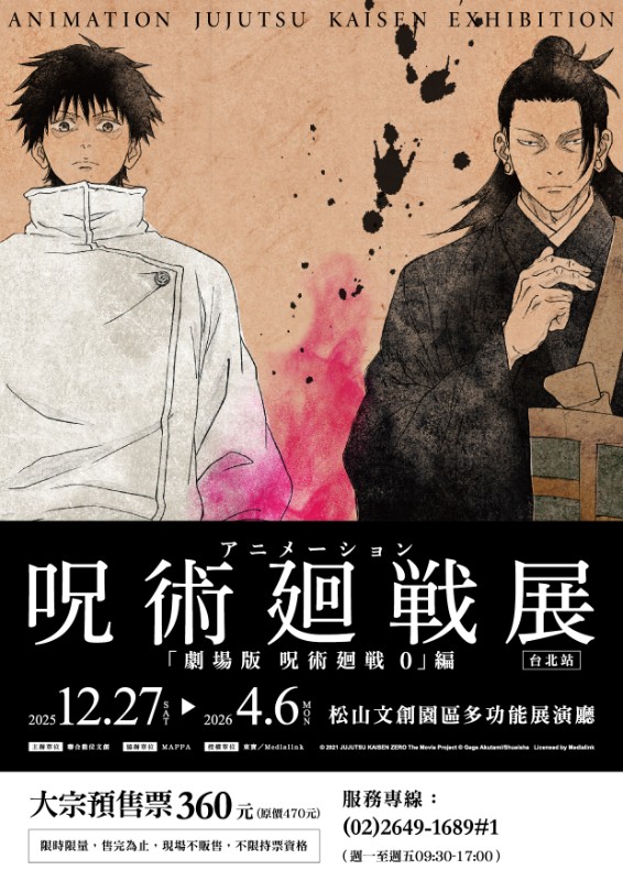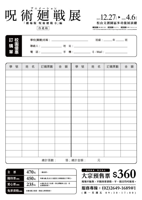 說明: 一、 風靡全亞洲的超人氣動漫作品《咒術迴戰》,憑藉其獨特的世界觀和極具特色的人物角色設定,迅速吸引大量粉絲喜愛,繼漫畫熱銷破億、動畫橫掃各大獎項、《劇場版咒術迴戰0》締造票房佳績後,再度以沉浸式展覽席捲亞洲!今年12月「咒術迴戰展《劇場版咒術迴戰0》篇」將完整重現劇場版的熱血場景與角色魅力,除了可近距離欣賞劇場版的珍貴幕後創作資料、「最強咒術師」五條悟1:1模型與多款咒具神還原展示,更特別的是展覽加碼展出動畫第1季與第2季「懷玉・玉折」篇的精彩內容,同時也邀請到日本知名水墨畫家こうじょう雅之(Kojo_masayuki),以獨樹一幟的筆墨技法重新詮釋角色風貌,帶來與動畫、漫畫截然不同的視覺震撼體驗。透過展覽,學生們不僅能夠欣賞到動畫中的精彩場景與美術技術,還能深入探討劇情中的各角色及事件衍生的情感、倫理及人性議題,藉此也能進一步探討東方文化符號的象徵與現今社會日益重要的情緒管理學習,適合規劃為一場融合動畫藝術、文化深度的跨領域學習體驗活動。 二、 展區亮點 (一) 劇場版咒術迴戰0》珍貴原畫、分鏡稿與設定資料。 (二) 《劇場版咒術迴戰0》夏油傑的服裝以及劇中登場的咒具神還原。 (三) 《劇場版咒術迴戰0》大型螢幕重現劇中「百鬼夜行」以及乙骨憂太與夏油傑激烈戰鬥的沉浸式空間,讓粉絲宛如親臨激戰現場! (四) 《劇場版咒術迴戰0》特級過咒願靈祈本里香第二次完全顯現的拍照打卡區。 (五) 《劇場版咒術迴戰0》日本知名水墨畫家こうじょう雅之(Kojo_masayuki),以擅長的武人畫風格重新演繹《劇場版咒術迴戰0》中的角色。 (六) 最帥氣的「五條悟等身大模型」現身會場! (七) 《懷玉.玉折》篇中,五條悟、夏油傑高專制服展出。 三、 展覽基本資訊: (一) 展覽時間:114年12月27日~115年4月6日(2/16(一)除夕休館) (二) 營業時間:每日10:00-18:00(17:30停止售票入場) (三) 展覽地點:台北市松山文創園區多功能展演廳 四、 票價: (一) 學校優惠票,不分大人、小孩皆為360元,平日、假日均可使用。 (二) 現場票價: 1、 全票470元:一般身分者適用。 2、 優待票450元: (1) 持大專院校(含)以下有效學生證件,以當學期註冊章為憑,入場須驗證,每證限購一張,碩博士生、社區大學、空中大學及在職進修等不適用。 (2) 年滿3歲(含)以上之兒童(未滿12歲兒童不可獨自入場,需成人持票陪同入場)。 五、 敬請惠予公告本展覽相關訊息於貴單位。 六、 檢送本活動海報、電子文宣正、反面及訂購單,呈請貴校員工、師生及家長踴躍參加。 七、 本案聯絡人:活動推廣部校園優惠票服務專線:(02)2649-1689#1(代表號)服務時間:周一至周五09:30-17:00。