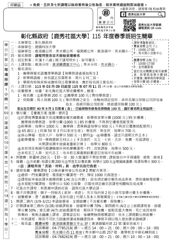 鹿秀社區大學-115年度春季班招生簡章,歡迎家長及民眾踴躍參加。