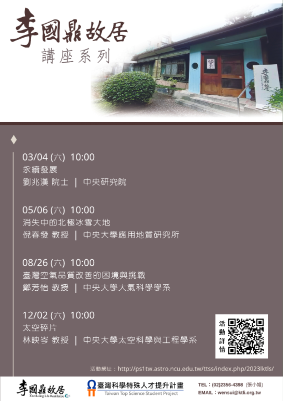 2.說明: 一、 活動訊息如下:(一) 日期:112年3月4日(六)、112年5月6日(六)、112年8月26日(六)、112年12月2日(六),共計4場。(二) 地點:李國鼎故居(地址:臺北市中正區泰安街2巷3號)。(三) 費用:免費。二、 報名方式:請於每堂講座開始一週前完成線上報名,網址:http://ps1tw.astro.ncu.edu.tw/ttss/index.php/2023lktls/。