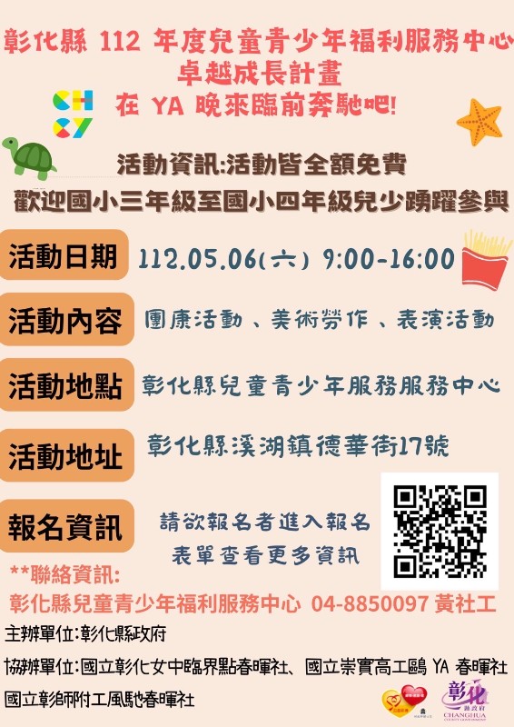 轉知彰化縣政府兒童青少年福利服務中心辦理「彰化縣112年度兒童青少年福利服務中心卓越計畫」方案計畫書及宣傳海報
