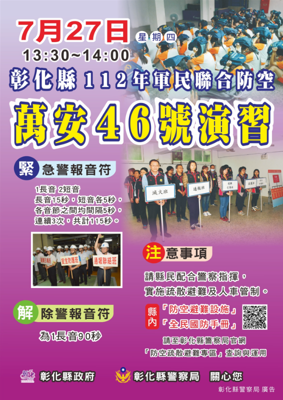 本年度軍民聯合防空(萬安46號)演習全民防空演練,訂於 112年7月27日(星期四)13時30分至14時舉行,實施30分鐘防空疏散演練;並於112年7月26日(星期三)13時30分至14時實施預演。 |