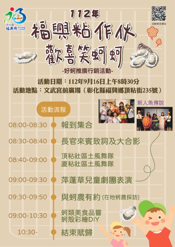轉知:彰化縣福興鄉公所訂於112年9月16日辦理「福興粘作伙,歡喜笑蚵蚵」好蚵推廣行銷活動 |