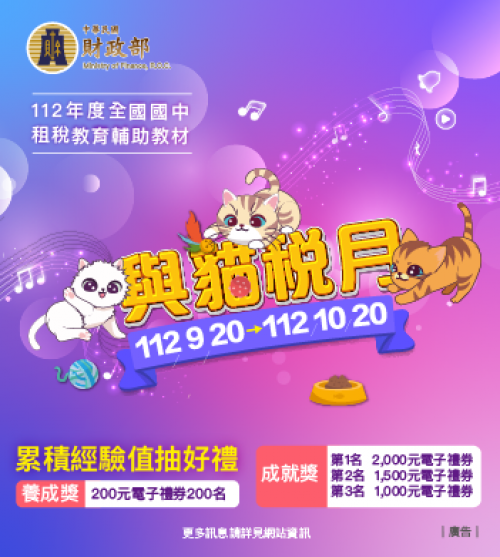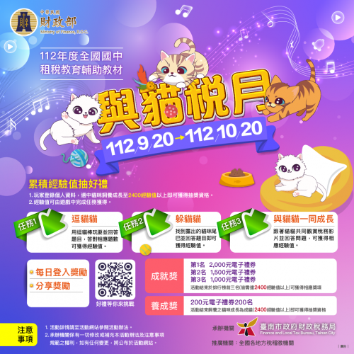 | 標題 | 有關臺南市政府財政稅務局辦理112年度全國國中租稅教育輔助教材「與貓稅月」線上遊戲抽獎活動,自即日起至112年10月20日止 |